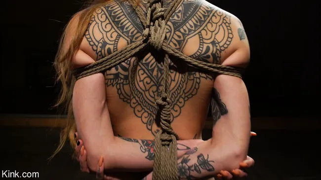 Her arms are boxed behind her with a chest harness keeping her restrained.