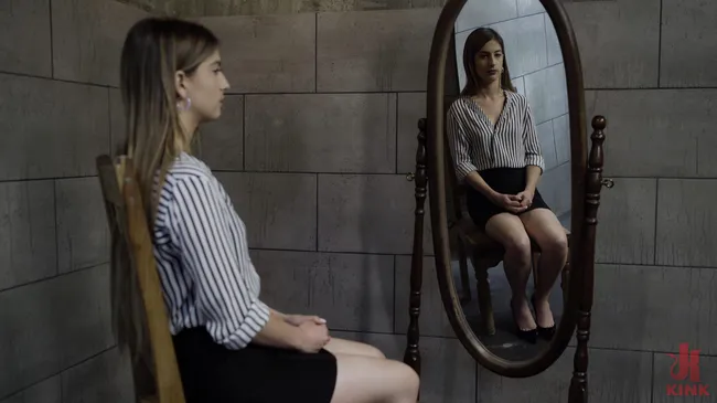 As she gazes into the dungeon mirror, Kristen can't help but crack a slight smile, clearly happy to be here and looking forward to what's to come.